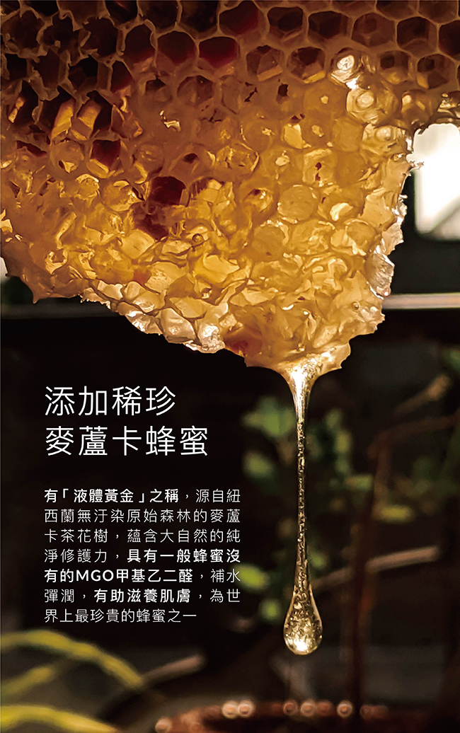2.添加稀珍麥蘆卡蜂蜜,具有一般蜂蜜沒有的MGO甲基乙二醛,補水彈潤,有助滋養肌膚。