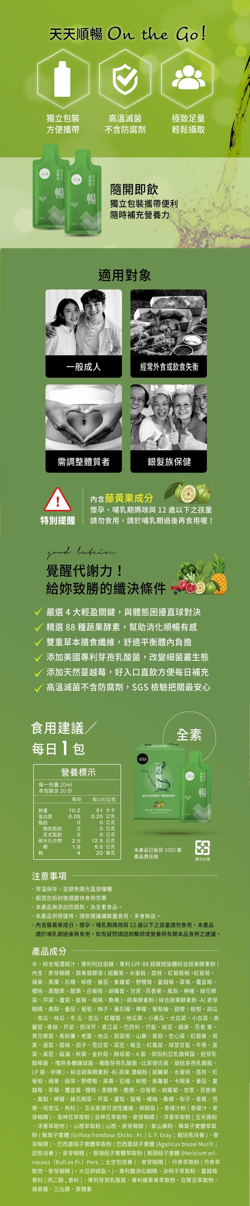 成分:水、綜合莓濃縮汁、專利阿拉伯糖、專利LVF-88超級微脂體綜合蔬果酵素粉(內含:麥芽糊精、蔬果發酵液(諾麗果、水蜜桃、荔枝、紅葡萄柚、 紅葡萄、蘋果、黑棗、石榴、柳橙、番茄、紫蘿蔔、野櫻莓、蔓越莓、草莓、覆盆莓、櫻桃、黑醋栗、醋栗、白葡萄、胡蘿蔔、甘蔗、 百香果、鳳梨、檸檬、綠花椰菜、芹菜、蘆筍、藍莓、楊梅、桑椹)、 蔬果酵素粉(綜合蔬果酵素粉-A(麥芽糊精、鳳梨、番茄、葡萄、梅子、番石榴、檸檬、葡萄柚、甜橙、椪柑、胡瓜、南瓜、絲瓜、冬 瓜、苦瓜、紅蘿蔔、地瓜葉、小黃瓜、大白菜、小白菜、高麗菜、 青椒、芹菜、西洋芹、青江菜、巴西利、芥藍、豌豆、蘋果、百香 果、青花椰菜、馬鈴薯、老薑、地瓜、甜菜根、山藥、香菇、空心菜、紅龍果、茼蒿、菠菜、甜椒、茄子、筊白筍、菜豆、敏豆、紅鳳菜、球莖甘藍、牛蒡、莧菜、萵苣、扁蒲、秋葵、金針菇、酵母菌、A菌 、 保加利亞乳酸桿菌、胚芽乳酸桿菌 、嗜熱多醣鏈球菌、嗜酸芽孢乳酸菌、 比菲德氏菌、凝結芽孢乳酸菌、 LP菌、砂糖)、綜合蔬果酵素粉-B(蔬果 濃縮粉(諾麗果、水蜜桃、荔枝、紅葡萄、蘋果、綠茶、野櫻莓、黑棗、石榴、柳橙、紫蘿蔔、卡姆果、番茄、蔓越莓、草莓、覆盆莓、 櫻桃、黑醋栗、醋栗、白葡萄、胡蘿蔔、甘蔗、百香果、鳳梨、檸檬、綠花椰菜、芹菜、蘆筍、藍莓、楊梅、桑椹、梨子、香蕉、芭樂、哈密瓜、枸杞)、玉米來源可溶性纖維、卵磷脂)、香檬汁粉(香檬汁、麥芽糊精)、洛神花萃取粉(洛神花萃取物、麥芽糊精)、洋蔥萃取粉(玉米澱粉、洋蔥萃取物)、山楂萃取粉(山楂、麥芽糊精)、 紫山藥粉、舞茸子實體萃取粉(舞茸子實體(Grifola frondosa (Dicks : Fr. ) S. F. Gray;栽培瓶培養)、麥芽糊精)、巴西蘑菇子實體萃取粉(巴西蘑菇子實體(Agaricus blazei Murill;固態培養)、麥芽糊精)、猴頭菇子實體萃取粉(猴頭菇子實體(Hericium erinaceus(Bull.ex Fr.)Pers.;太空包培養)、麥芽糊精)、丹參萃取粉(丹參萃取物、麥芽糊精)、大豆卵磷脂。)、專利難消化糊精、決明子萃取粉、蔓越莓香料(丙二醇,香料)、專利芽孢乳酸菌、專利藤黃果萃取物、白腎豆萃取物、蘋果酸、三仙膠、蔗糖素