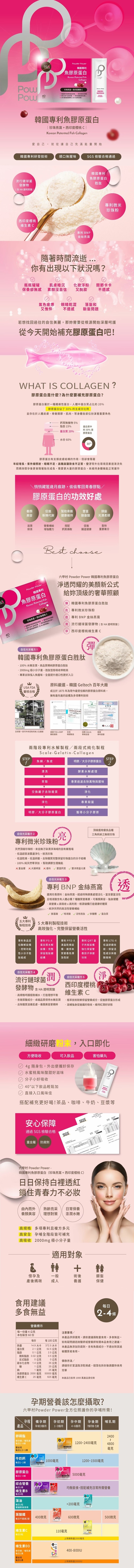 成分:韓國專利魚膠原蛋白2000毫克,水蜜桃果汁粉(砂糖,水蜜桃果汁粉(水蜜桃濃縮汁,麥芽糊精,辛烯基丁二酸鈉澱粉,檸檬酸,玉米澱粉,檸檬酸鈉,水蜜桃香料(含轉化糖漿) β-胡蘿蔔素(麥芽糊精,阿拉伯膠,中鏈三酸甘油酯,蔗糖,L-抗壞血酸鈉(抗氧化劑) β-胡蘿蔔素,二氧化矽,生育醇(維生素E)(抗氧化劑)水溶性纖維,造粒葡萄糖,西印度櫻桃萃取物(內含25%維生素C),專利微米珍珠粉,流行鏈球菌發酵物(玻尿酸),專利LP-10蛋白質多醣凍晶包埋技術副乾酪乳桿菌粉,專利BNP金絲燕窩粉